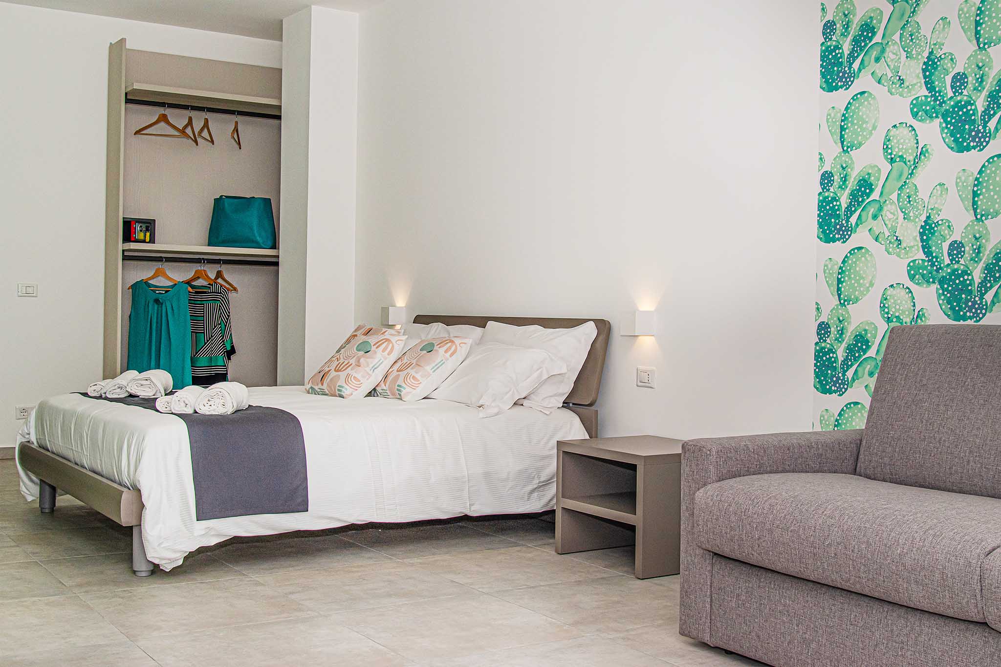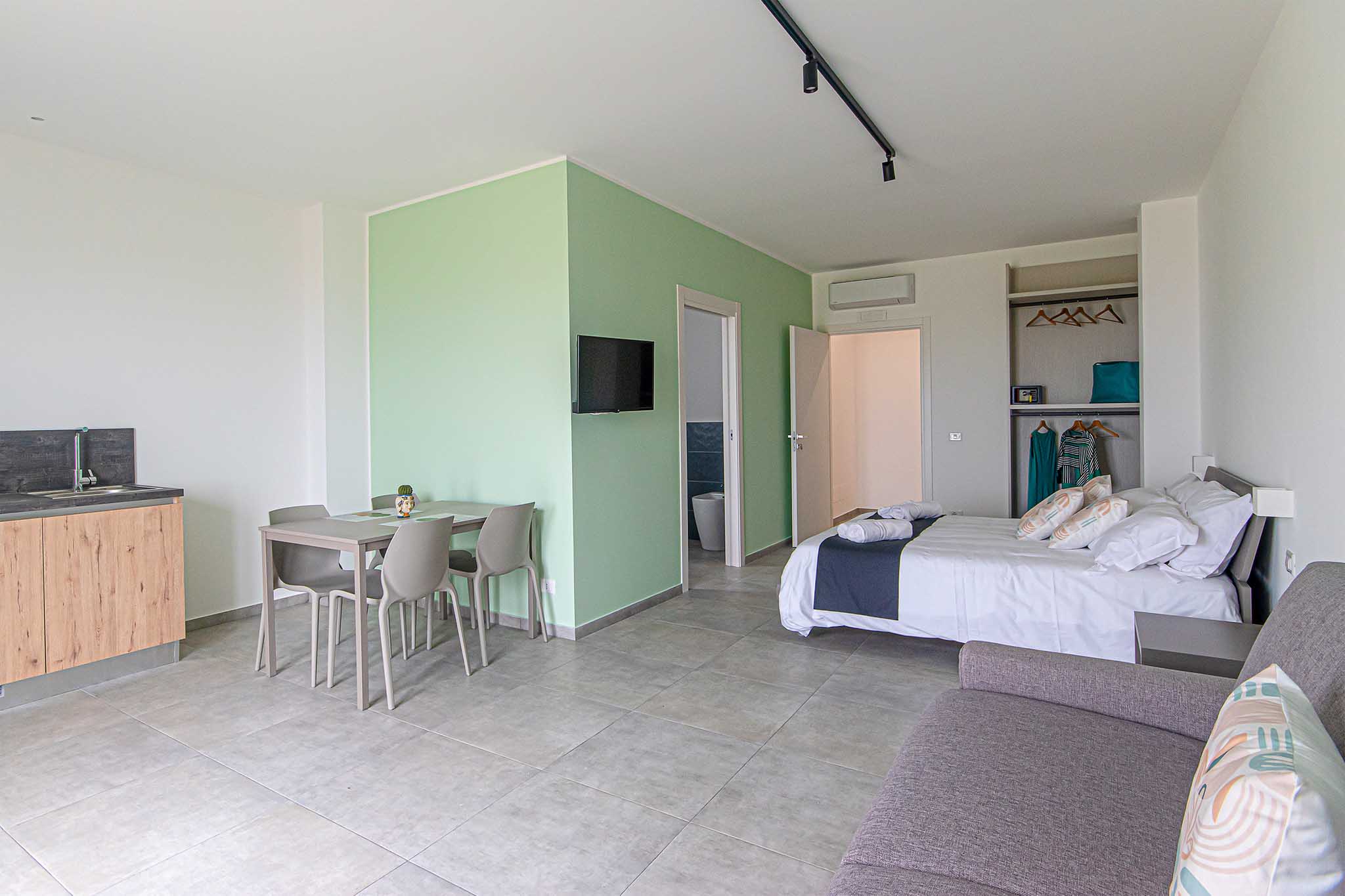 La nostra camera 2 è ampia e accogliente, comoda anche per 4 persone poichè dotata di un comodo divano letto 2 posti large. Una funzionale cucina accessoriata, comprensiva di zona pranzo.La camera possiede un balcone con vista che dai monti si spinge fino al mar Meditteraneo.