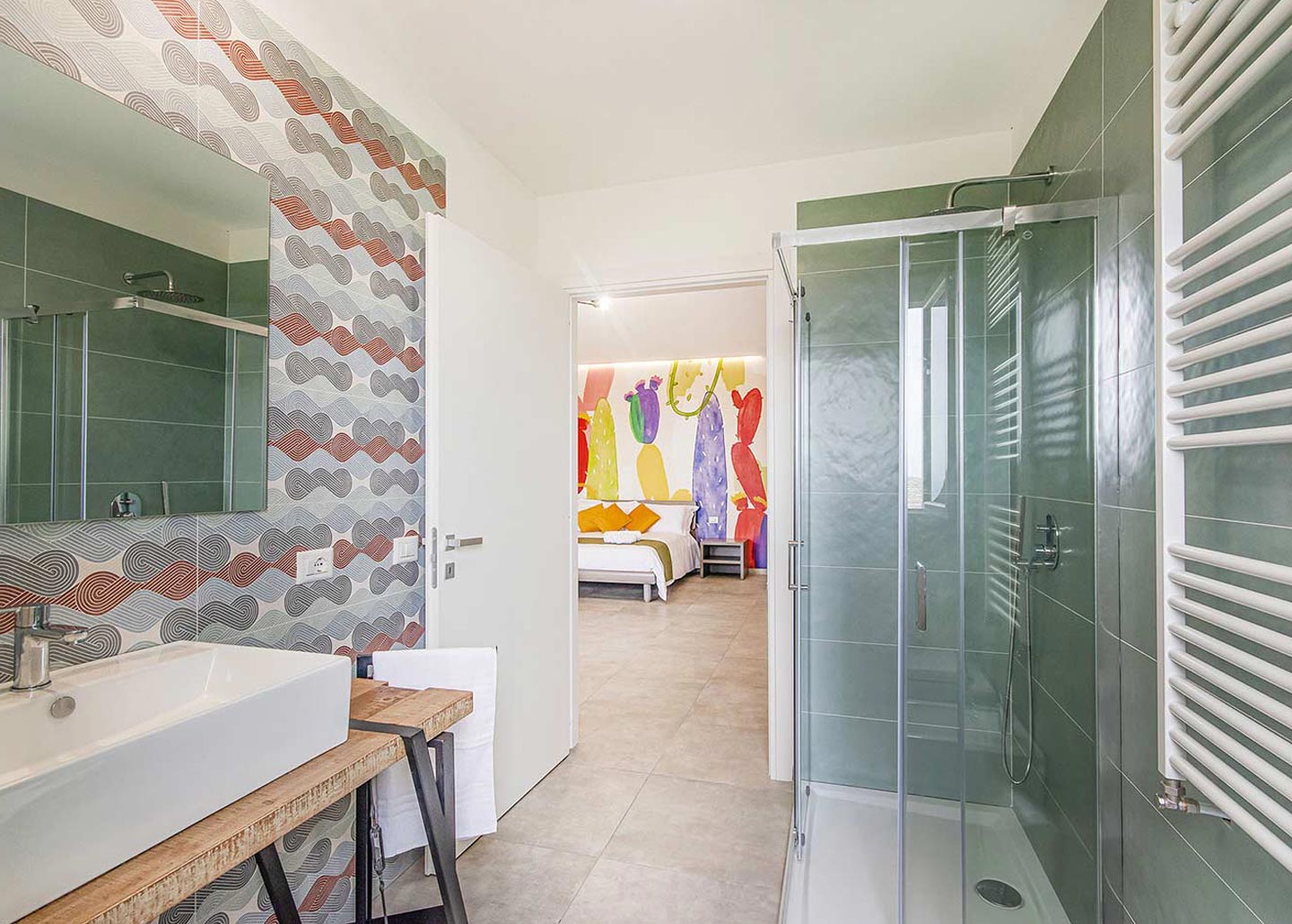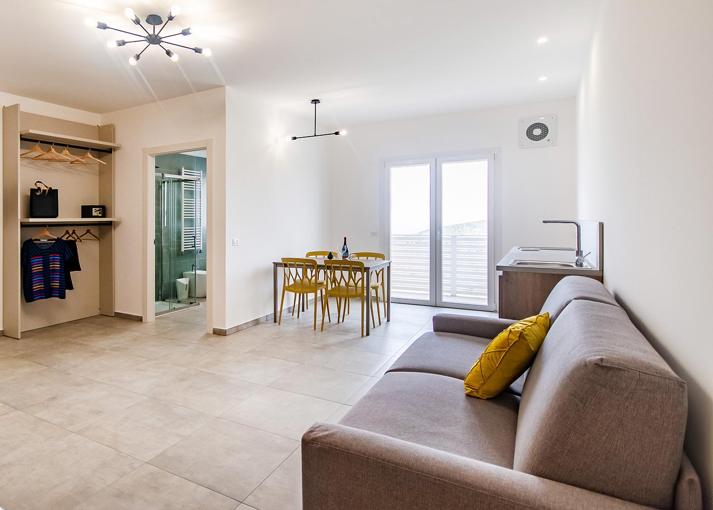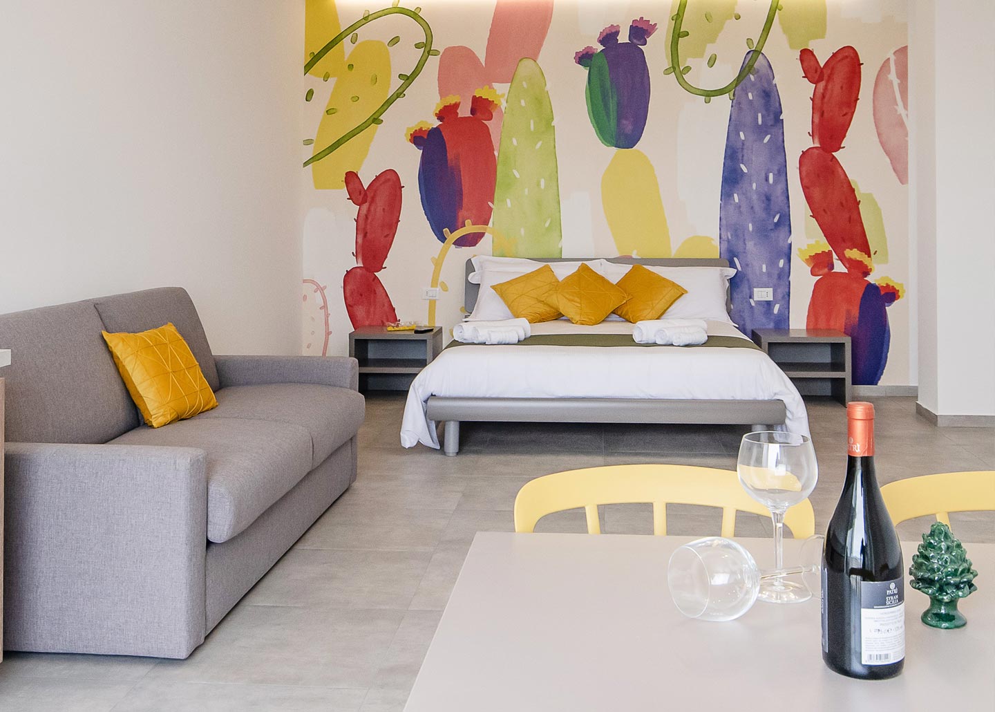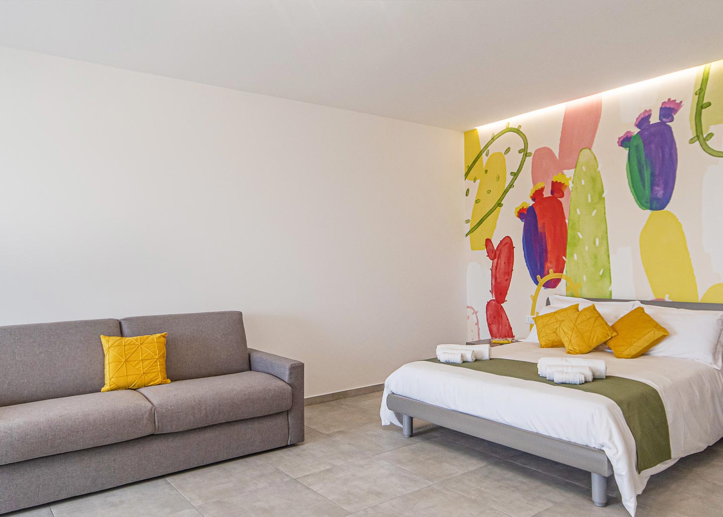 La nostra camera 4 è colorata e luminosa, comoda anche per 4 persone poichè dotata di un comodo divano letto 2 posti large. Una funzionale cucina accessoriata, comprensiva di zona pranzo.La camera possiede un balcone con una sorpredente vista che dalla terra arriva al mare.